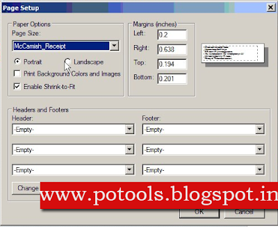 12. Select paper size as “McCamish_Receipt” from dropdown list, paper orientation: “portrait”, “enable shirk – to – fit”. And give margin (inches) as: left-0.2, right-0.638, top-0.194, bottom-0.201 and click on “Change Font”.